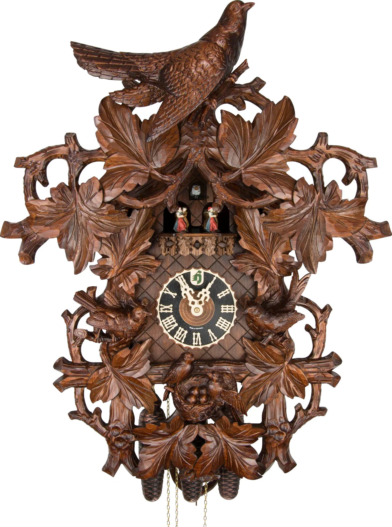 This magnificent sculpted style cuckoo clock will cuckoo the hour each hour, and once on the half hour. After it cuckoos the full hour it will play one of two melodies ("Edelweiss" & "The Happy Wanderer") while the dancers rotate. Six feet of chain will hang below the clock with three pine cone shaped cast weights. Wooden dial, hands, and cuckoo bird. Walnut Stain. Automatic Night -Off Option.