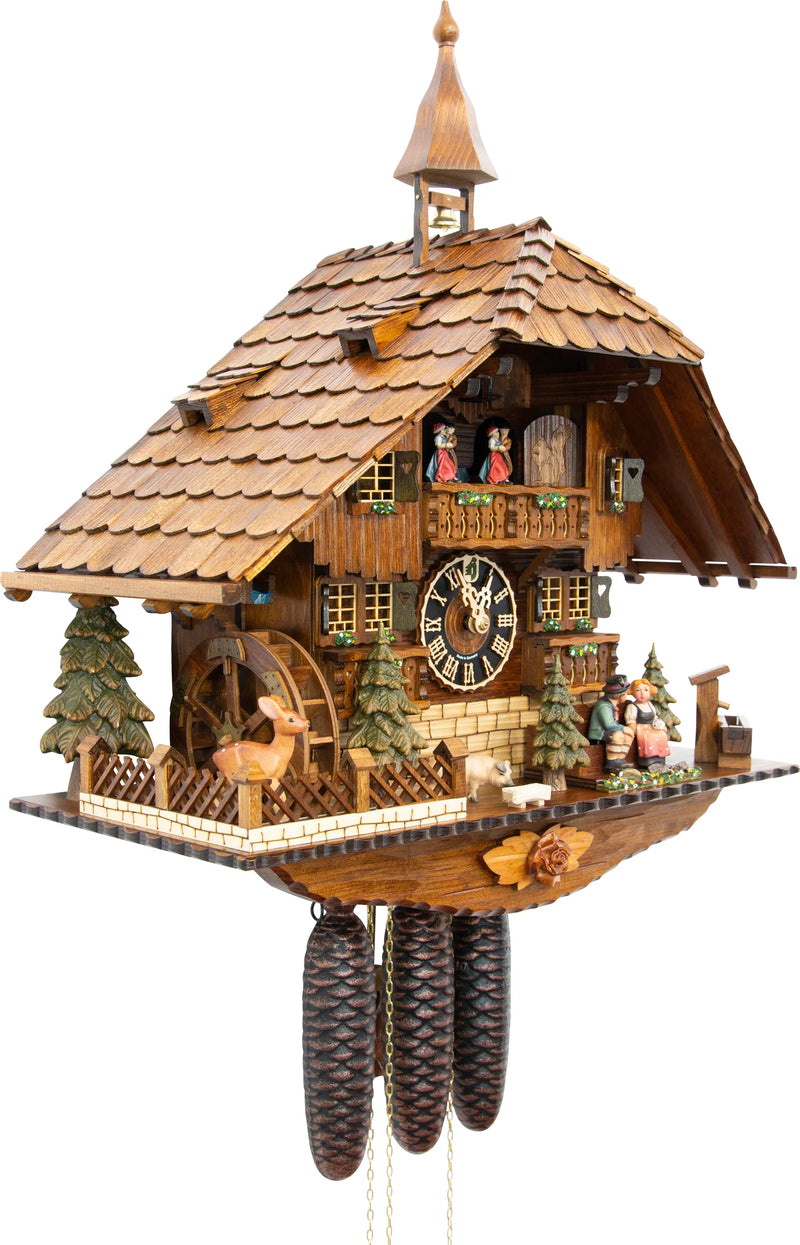 This beautiful KU838M 8-Day Musical Chalet with Kissing Couple will charm and delight with its detail and craftsmanship. Every hour, the clock cuckoos the number of hours and plays one of two melodies ("Edelweiss" & "The Happy Wanderer") while the dancers rotate, the water wheel turns, and the boy slides closer to the girl on the bench to kiss her. Cuckoos once at the half hour. Hand-crafted in the Black Forest in Germany, this stunning Black Forest cuckoo clock is made of bass wood and features a wooden dial, clock hands, and cuckoo bird. This clock includes a shut-off lever with automatic nighttime shut-off. With six feet of chain and three pine cone shaped cast weights, it's a perfect addition to any room!